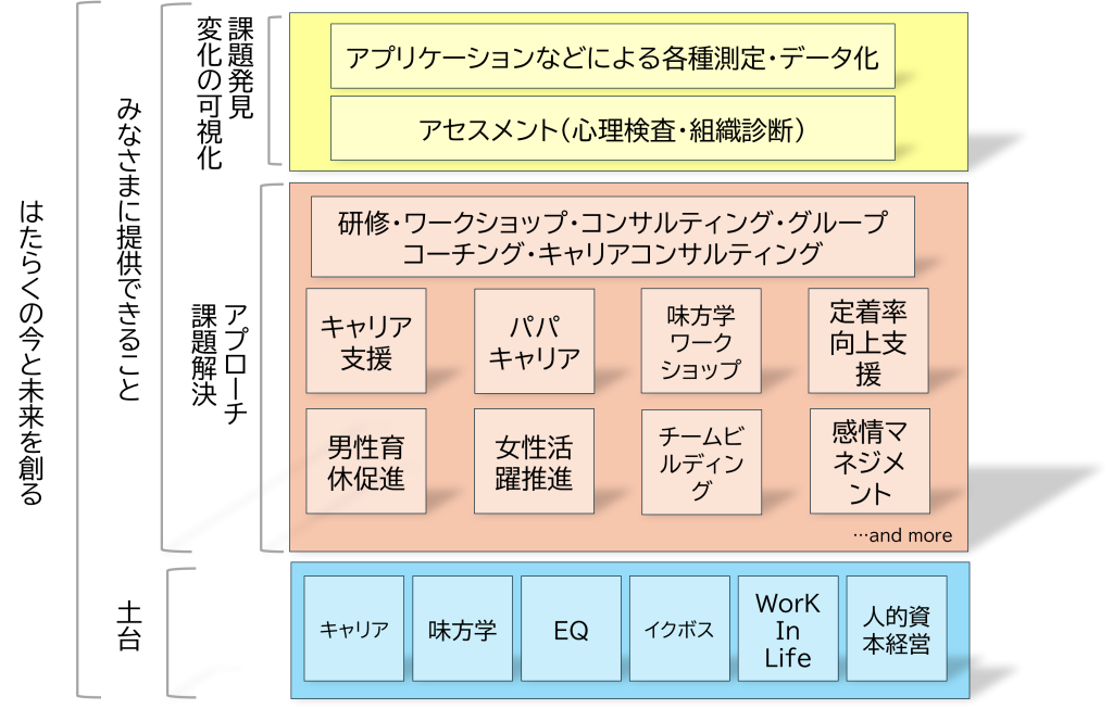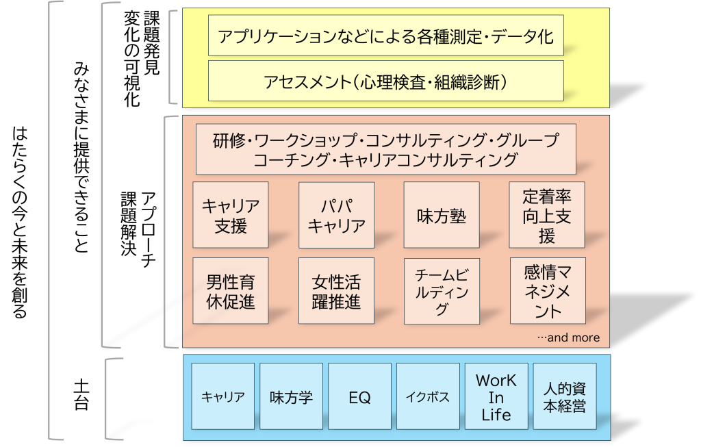 | キャリア支援 | 個別のキャリアコンサルティングから階層をはじめとした属性を決めてのキャリア研修を実施します。理論に基づきつつも、参加者される方の声を聞き、自律しキャリアをデザインできるように関わります。 |